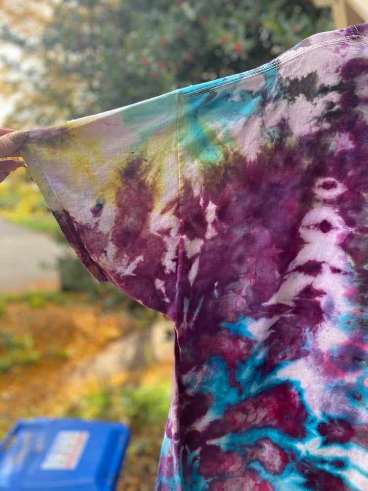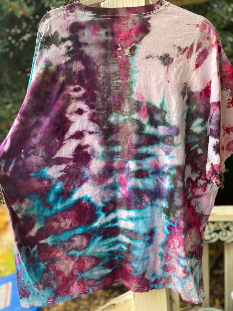 One of a kind, short sleeve tie dye, Godzilla Be Gay Do Crime shirt.