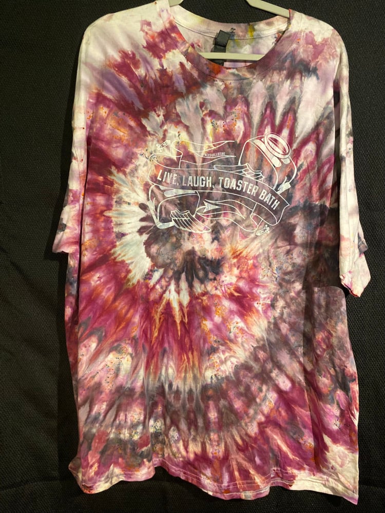 One of a kind, short sleeve tie dye, Live Laugh Toaster Bath shirt.