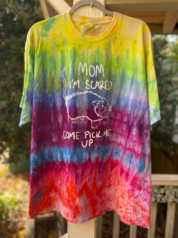 One of a kind, short sleeve tie dye, Mom I'm Scared Come Pick Me Up shirt.