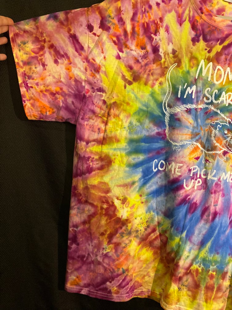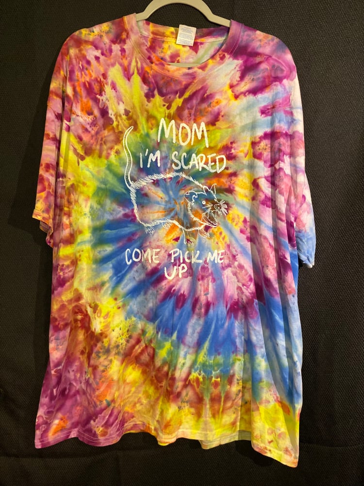 One of a kind, short sleeve tie dye, Mom I'm Scared Come Pick Me Up shirt.