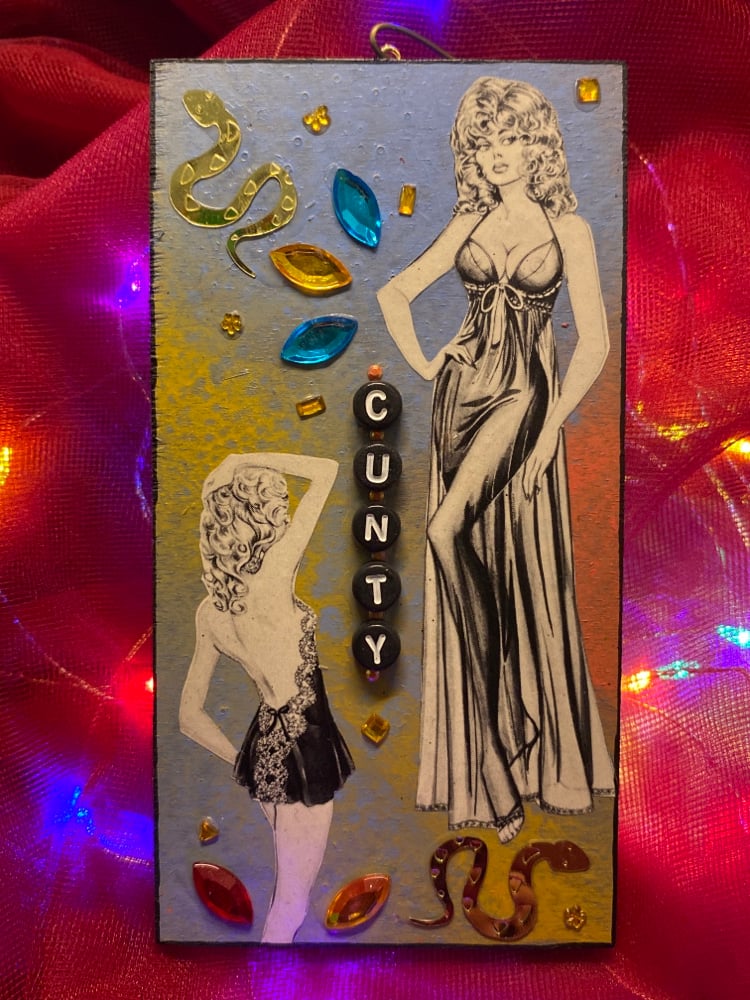 -Each Pornament is made out of lightweight wood, then spray painted, collaged and bedazzled by our team of horny elves.