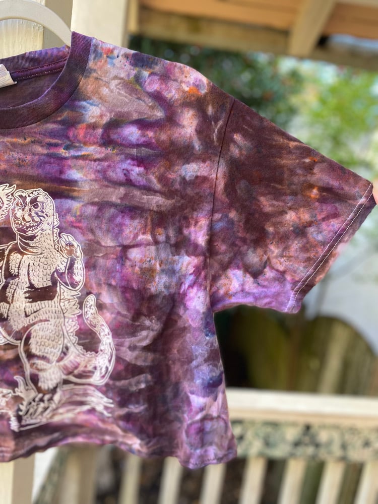 One of a kind, short sleeve tie dye, Godzilla Be Gay Do Crime shirt.