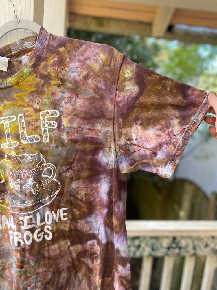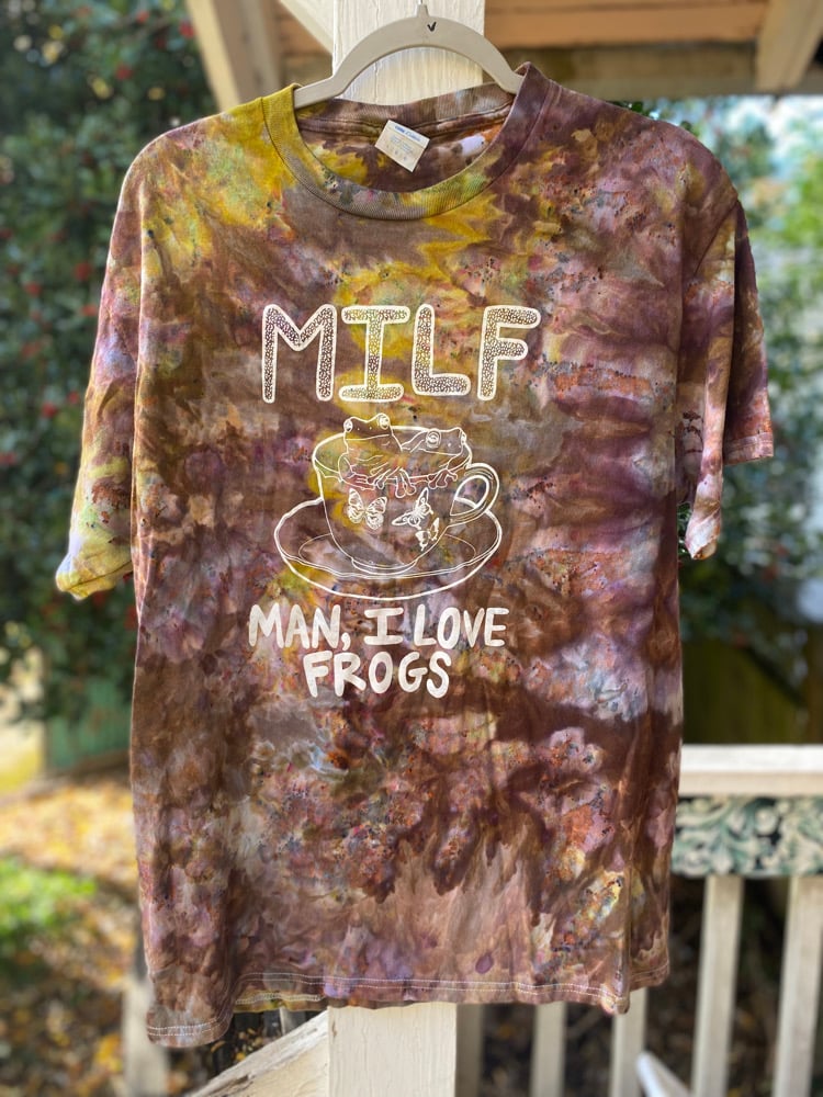 One of a kind, short sleeve tie dye, MILF Man I Love Frogs shirt.
