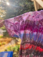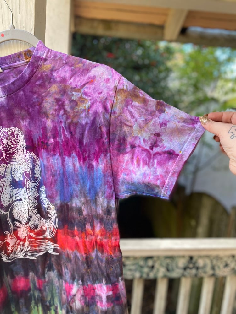 One of a kind, short sleeve tie dye, Godzilla Be Gay Do Crime shirt.
