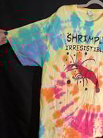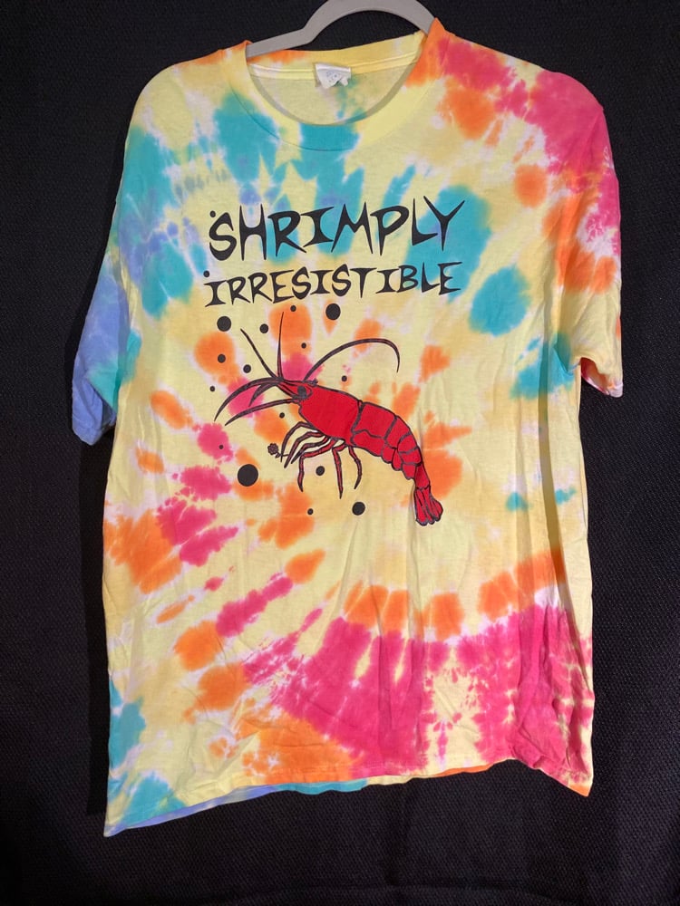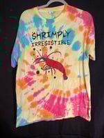 One of a kind, short sleeve tie dye, Shrimply Irresistible shirt.