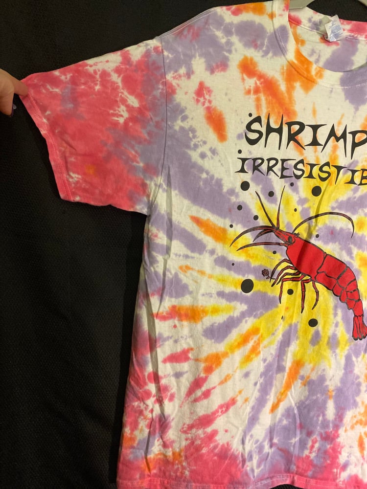One of a kind, short sleeve tie dye, Shrimply Irresistible shirt.