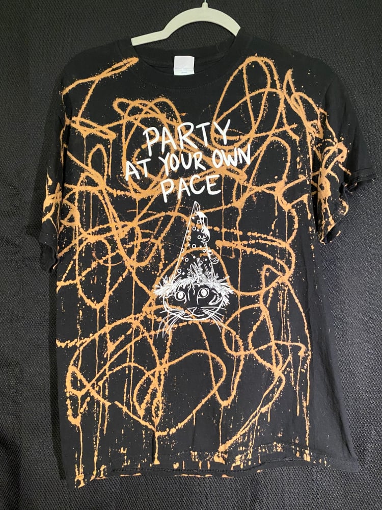 One of a kind, short sleeve bleach dye, Party At Your Pace shirt.