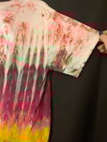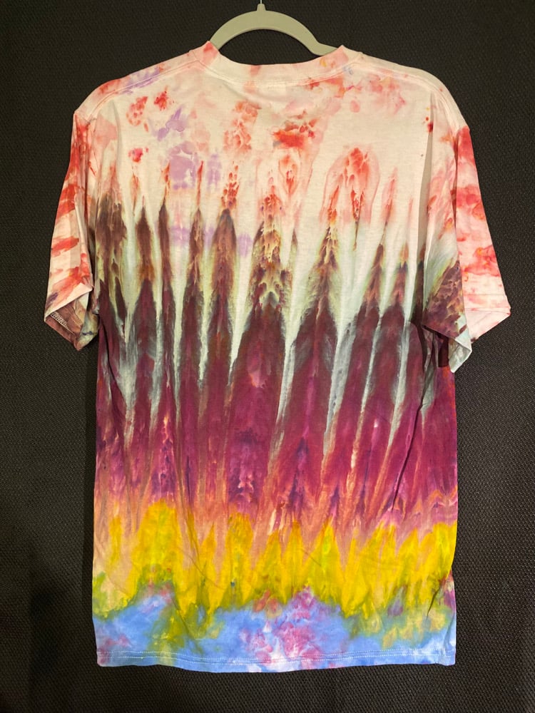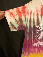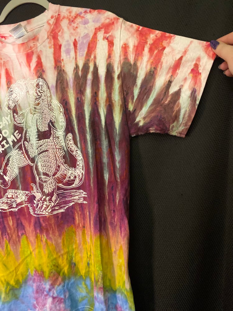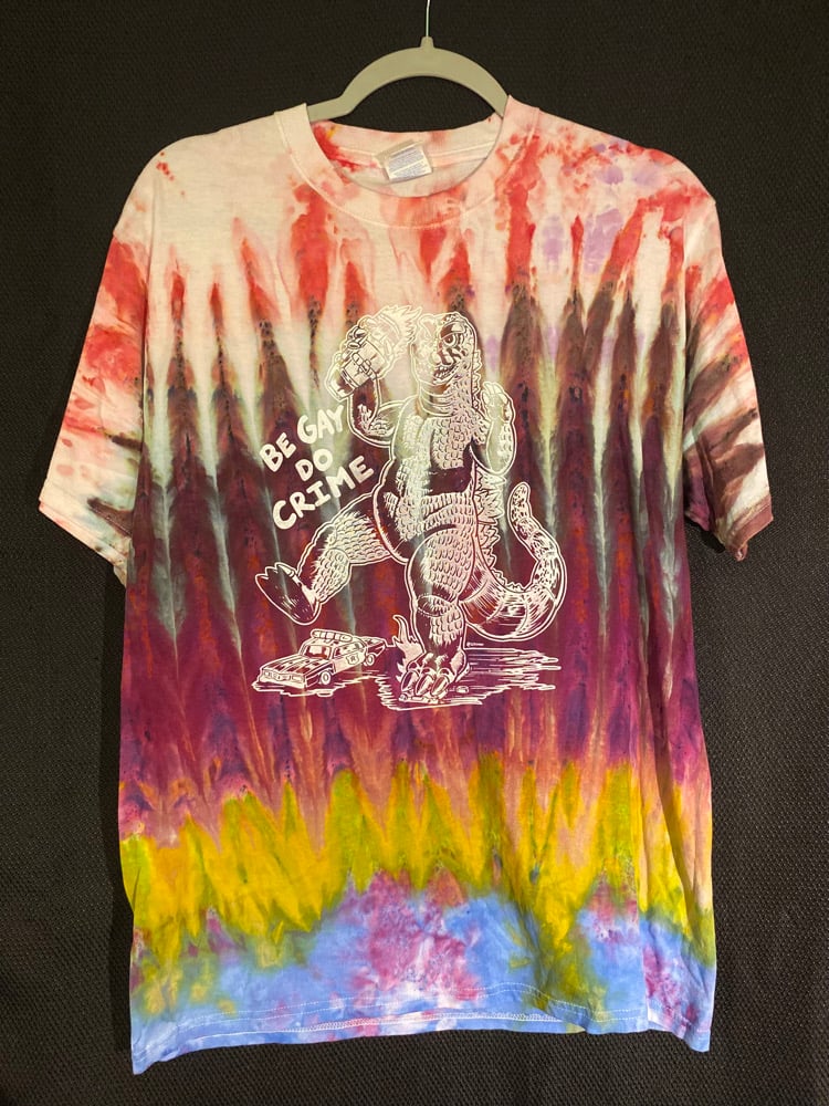 One of a kind, short sleeve tie dye, Godzilla Be Gay Do Crime shirt.