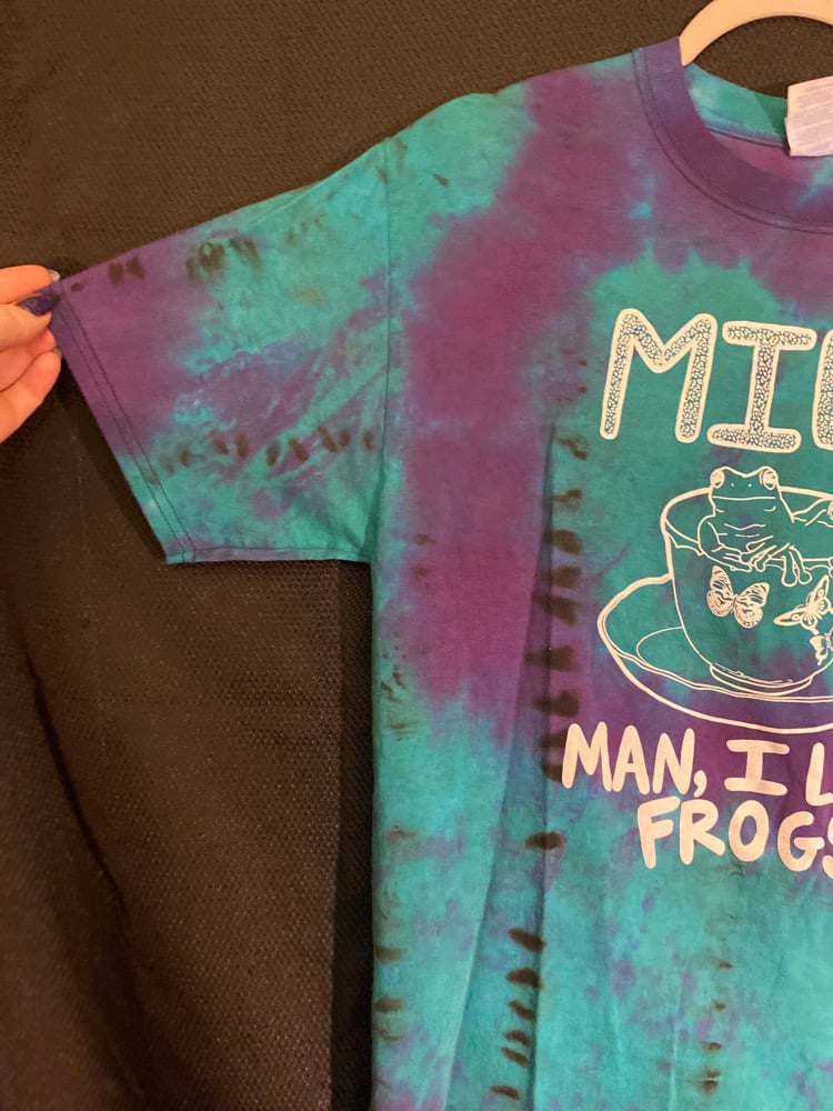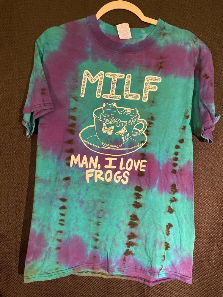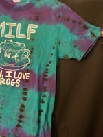 One of a kind, short sleeve tie dye, MILF Man I Love Frogs shirt.