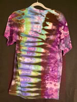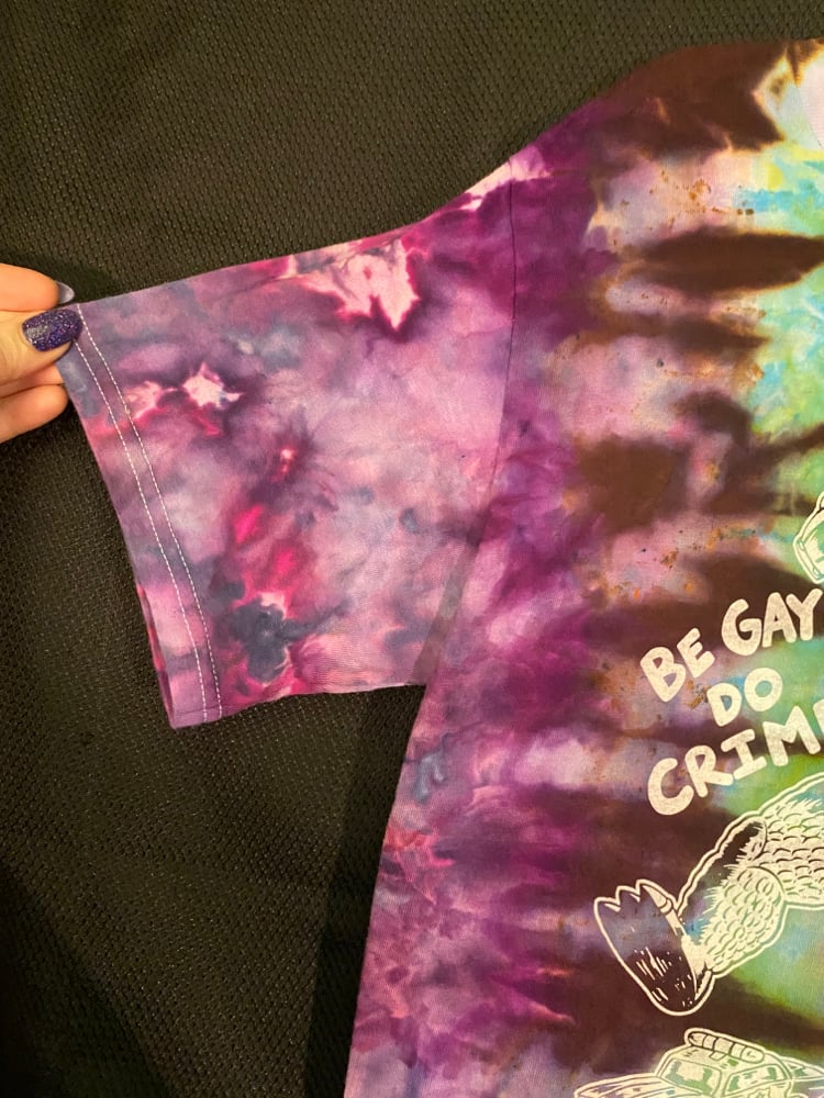 One of a kind, short sleeve tie dye, Godzilla Be Gay Do Crime shirt.