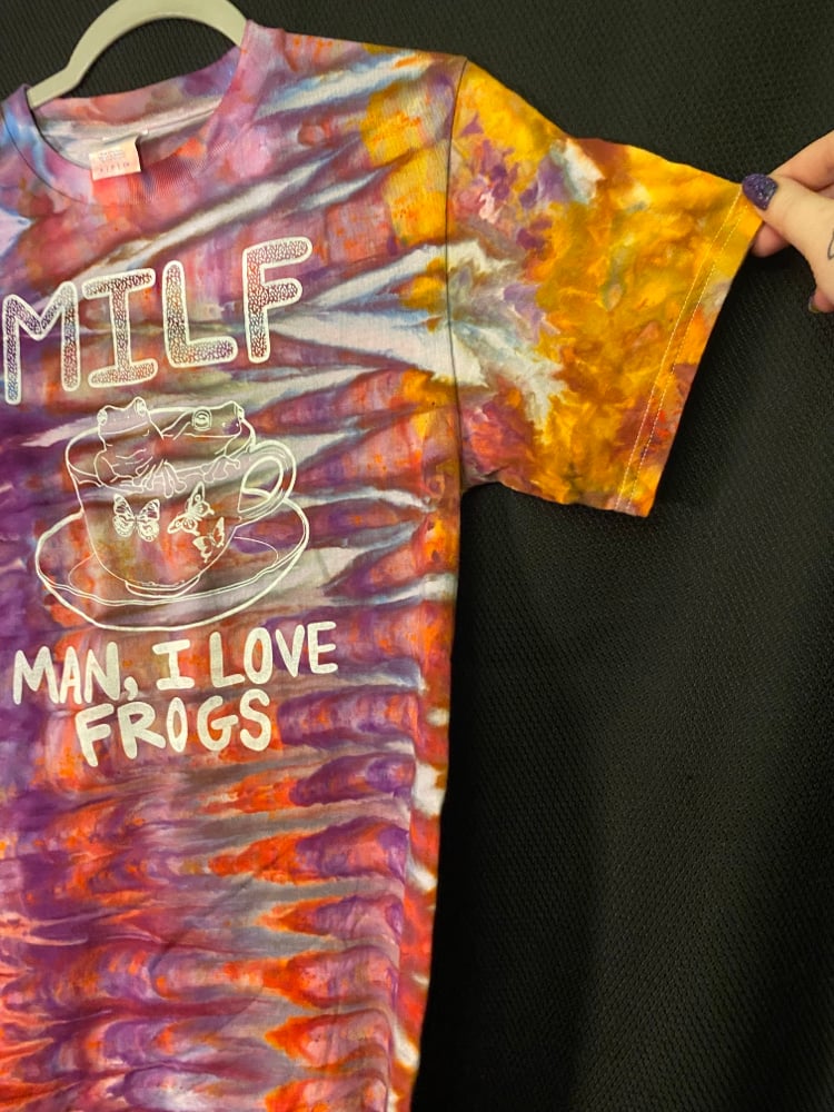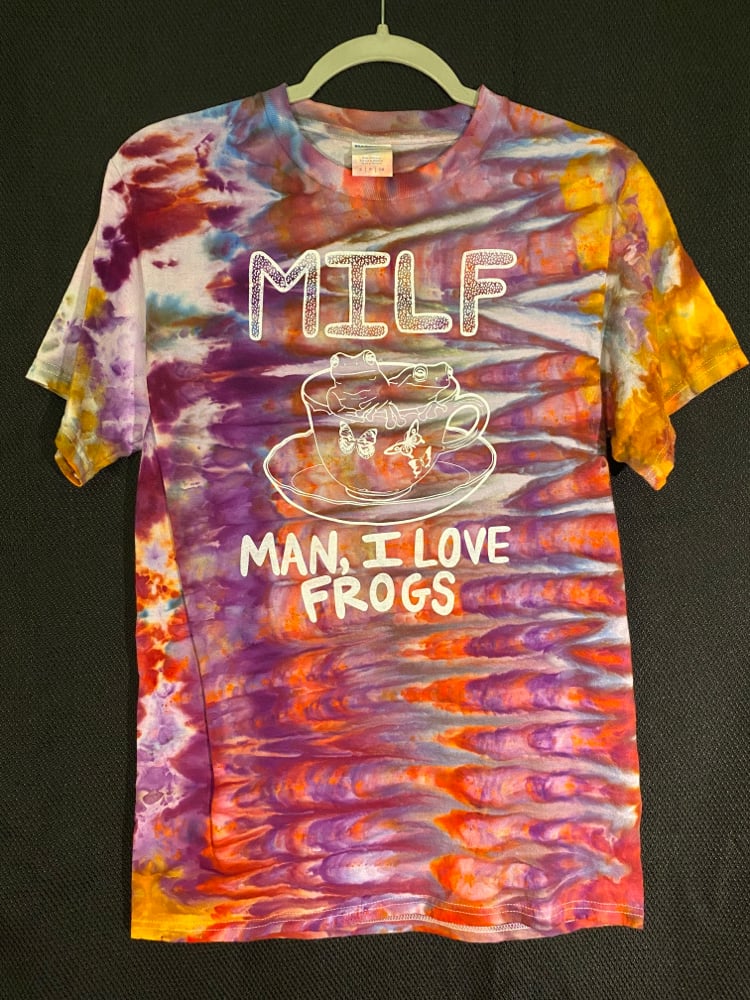 One of a kind, short sleeve tie dye, MILF Man I Love Frogs shirt.