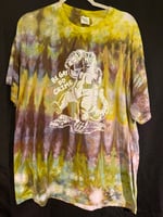 One of a kind, short sleeve tie dye, Godzilla Be Gay Do Crime shirt.