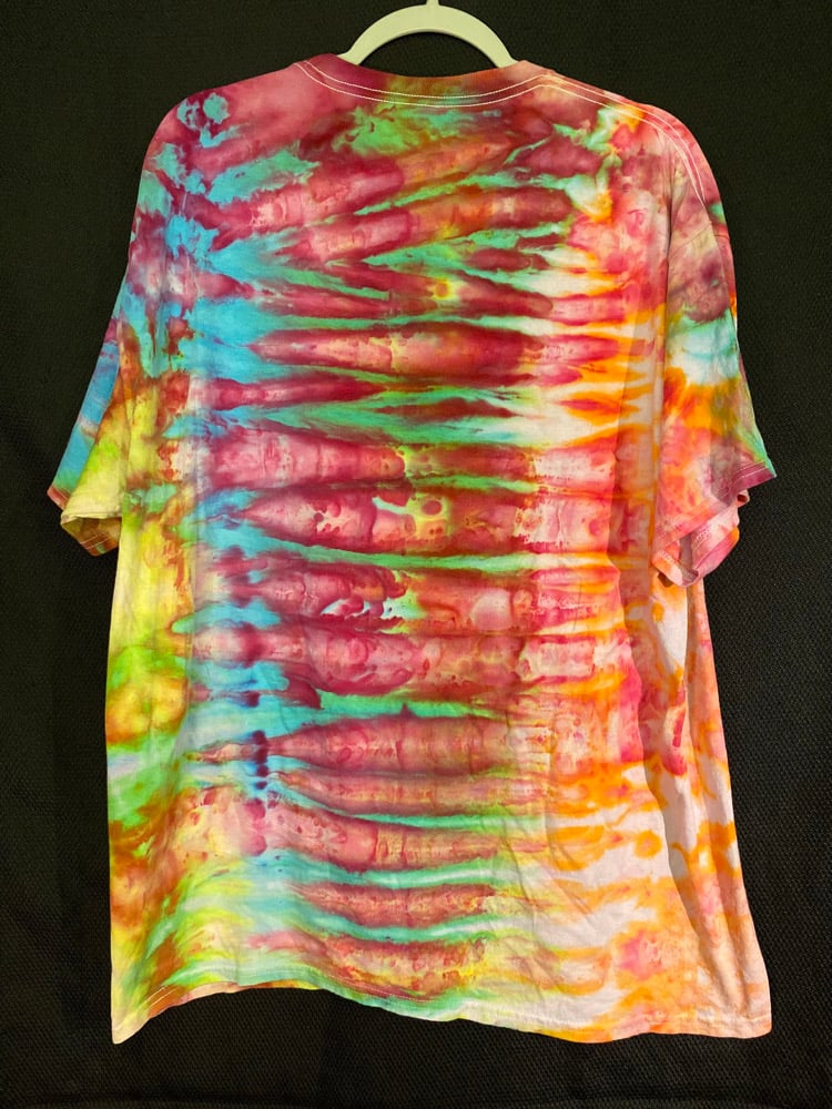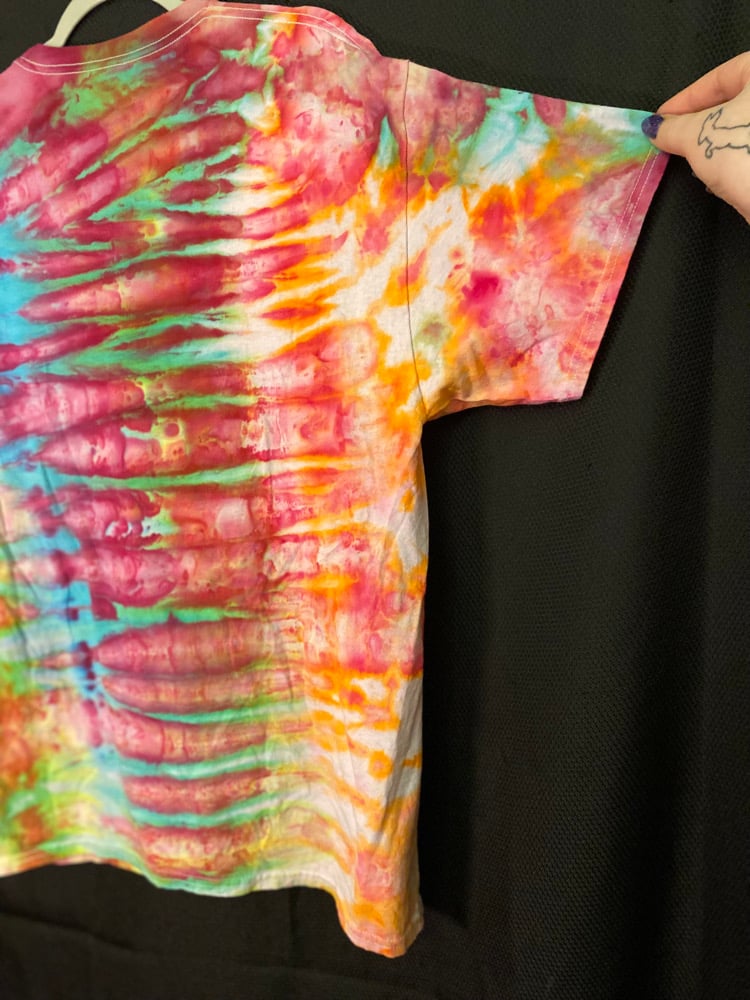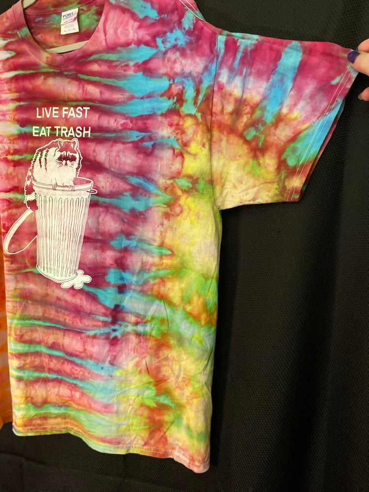 One of a kind, short sleeve tie dye, Live Fast Eat Trash Raccoon shirt.