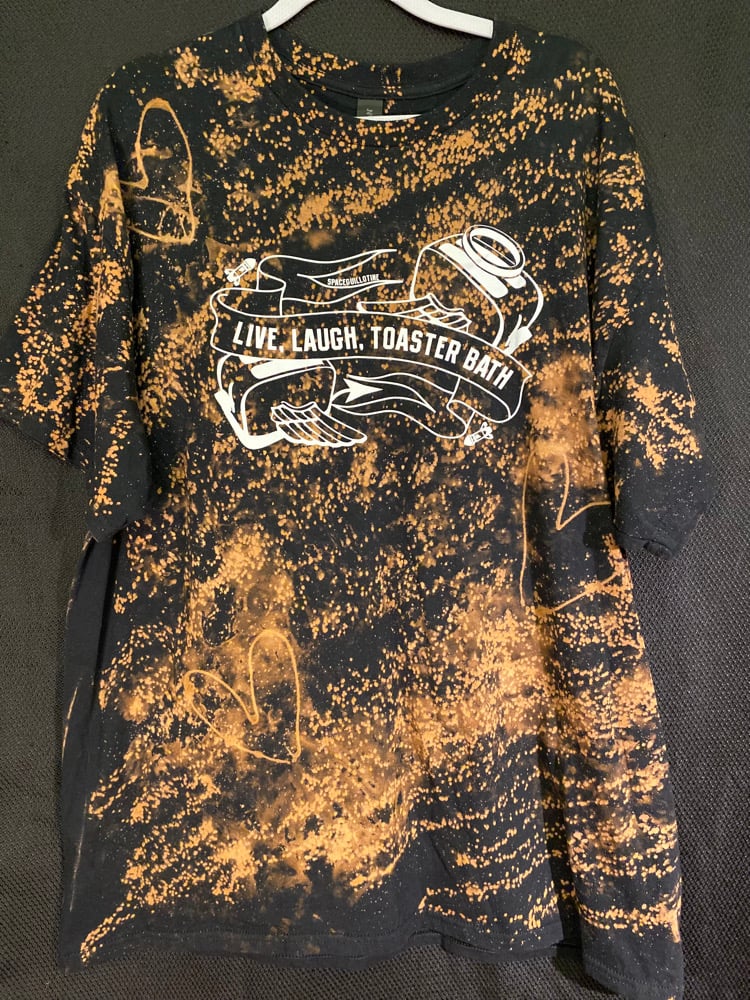 One of a kind, short sleeve tie dye, Live Laugh Toaster Bath shirt.