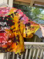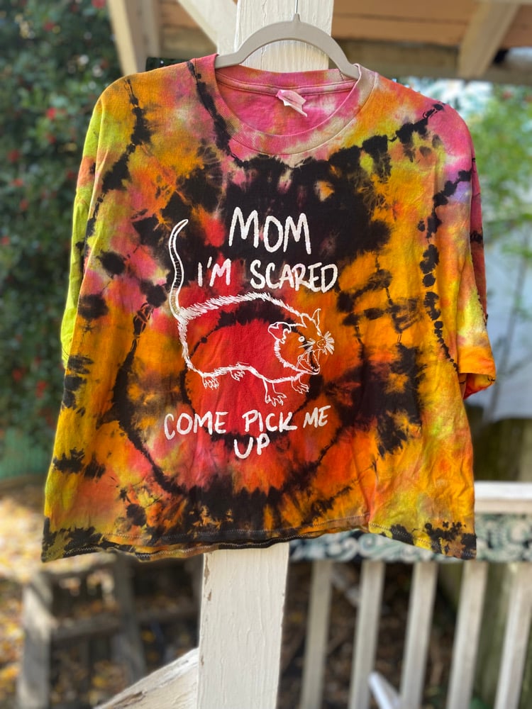 One of a kind, short sleeve REVERSE (started as black, white brited, then dyed) tie dye, Mom I'm Scared Come Pick Me Up shirt.
